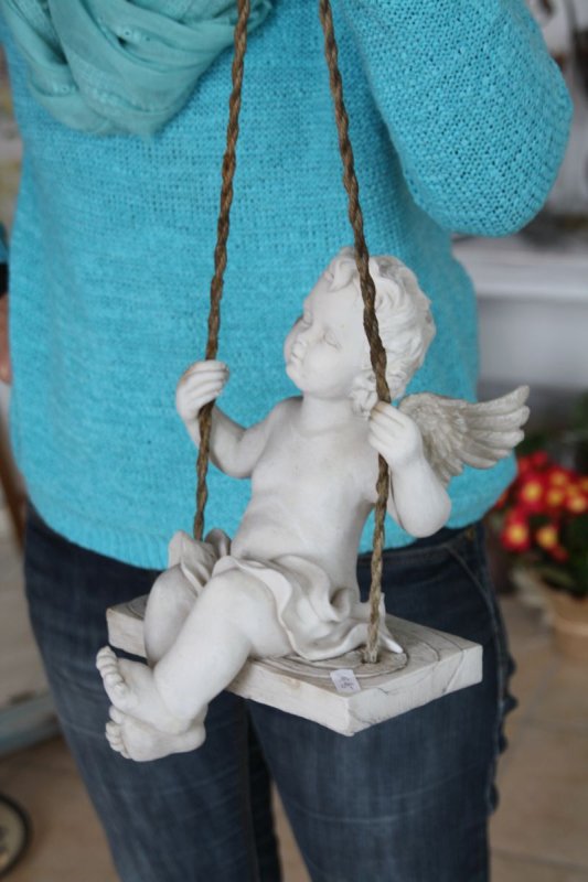 • Niedlicher, schaukelnder Engel aus Polyresin. B 19,5 cm, H ca. 30 cm, T ca. 25 cm